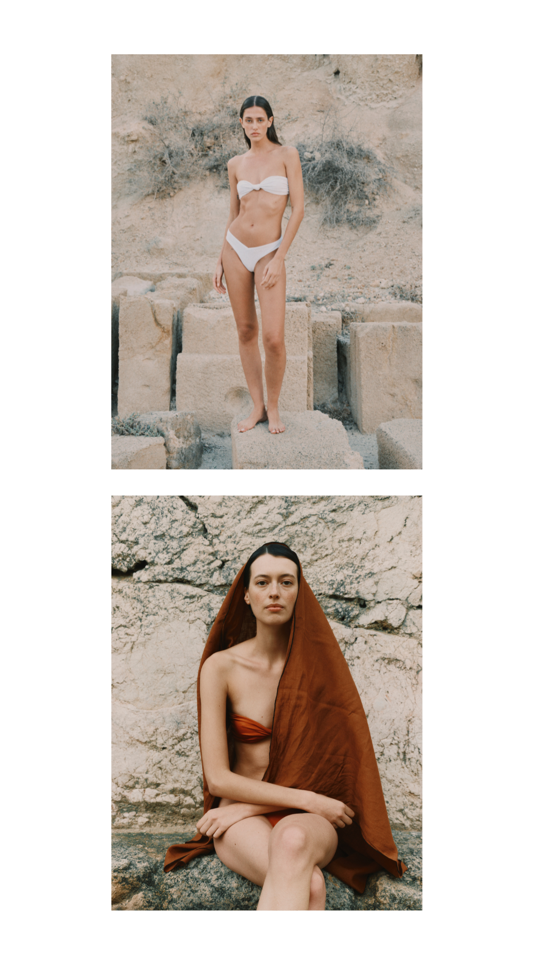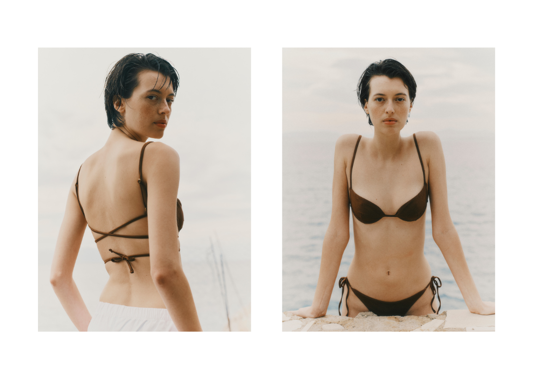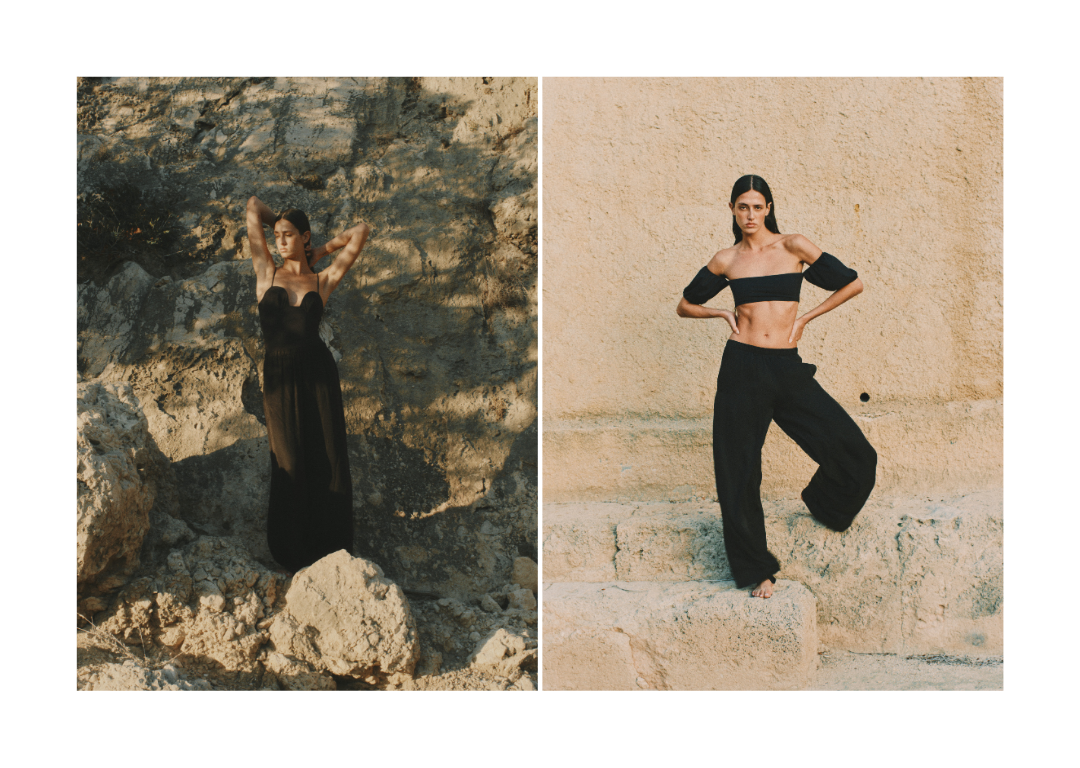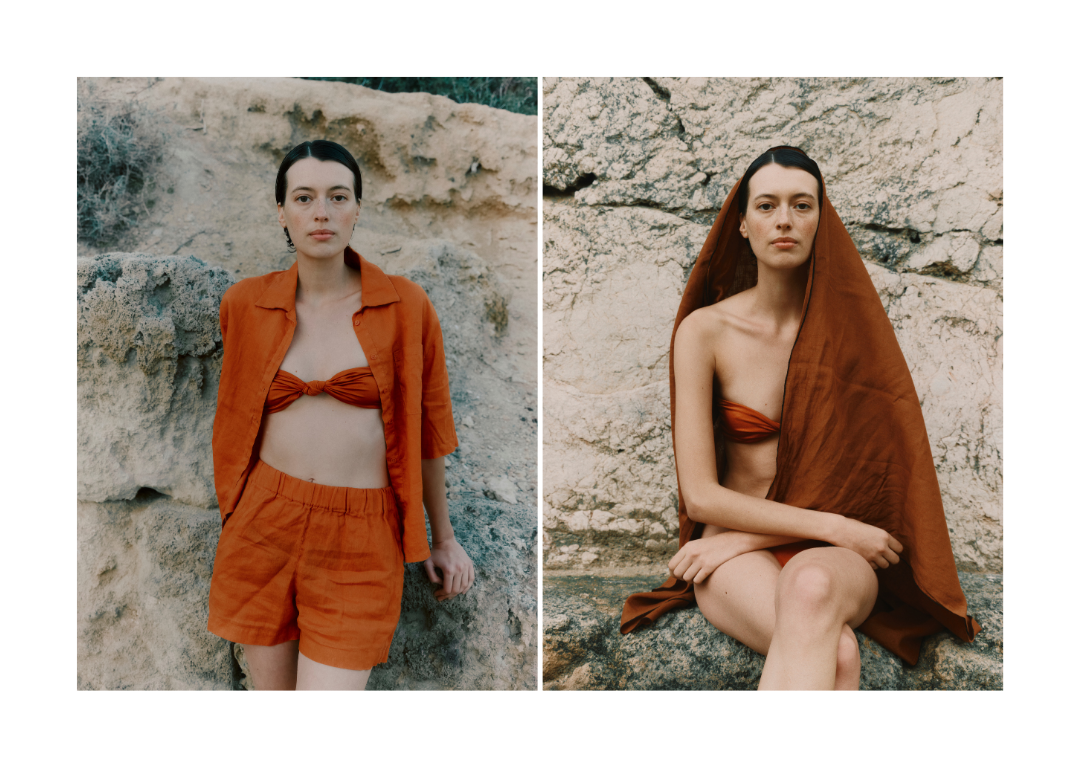 To complement this swimwear line, a thoughtfully designed wardrobe unfolds: dresses with balloon sleeves, airy silk crepe tunics, wide-leg trousers, and linen ensembles.